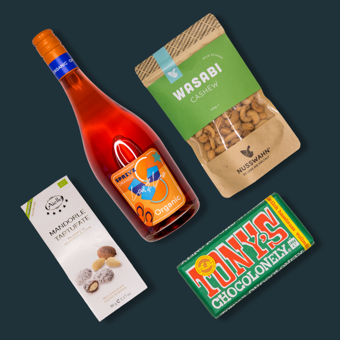 Wein (Bio Trauben, Antioxidantien: Kaliumbisulfit), Wasser, Bio-Rübenzucker, Bio konzentrierter Traubenmost, Kohlendioxid, Natürliches Zitrusfrüchte-Kräuter-Aroma, Natürliches Vanillearoma, Natürliches Mandarinenaroma, Natürliches Orangenaroma, Zitronensäure, Farbstoff: Karotten und Schwarze-Johannisbeer-Konzentrat, Natürliche Aromastoffe, Apfel- und Färberdistel-Konzentrat